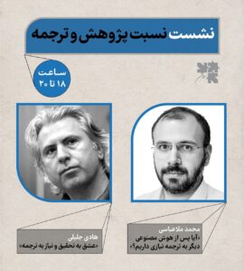 سخنرانان نشست «نسبت پژوهش و ترجمه» هادی جلیلی، دانش‌آموخته کارشناسی‌ارشد علوم اجتماعی از دانشگاه علامه طباطبایی، مترجم و پژوهشگر و محمد ملا عباسی، دانش‌آموخته دکتری علوم اجتماعی از دانشگاه علامه طباطبایی، استاد دانشگاه و سردبیر نشر ترجمان بودند. در این نشست، هادی جلیلی و محمد ملا عباسی به‌نقد وضعیت آکادمی و تبیین جایگاه مترجم در عصر هوش مصنوعی پرداختند. در ادامه، خلاصه و اهم مطالب عنوان شده در این نشست آورده شده است: