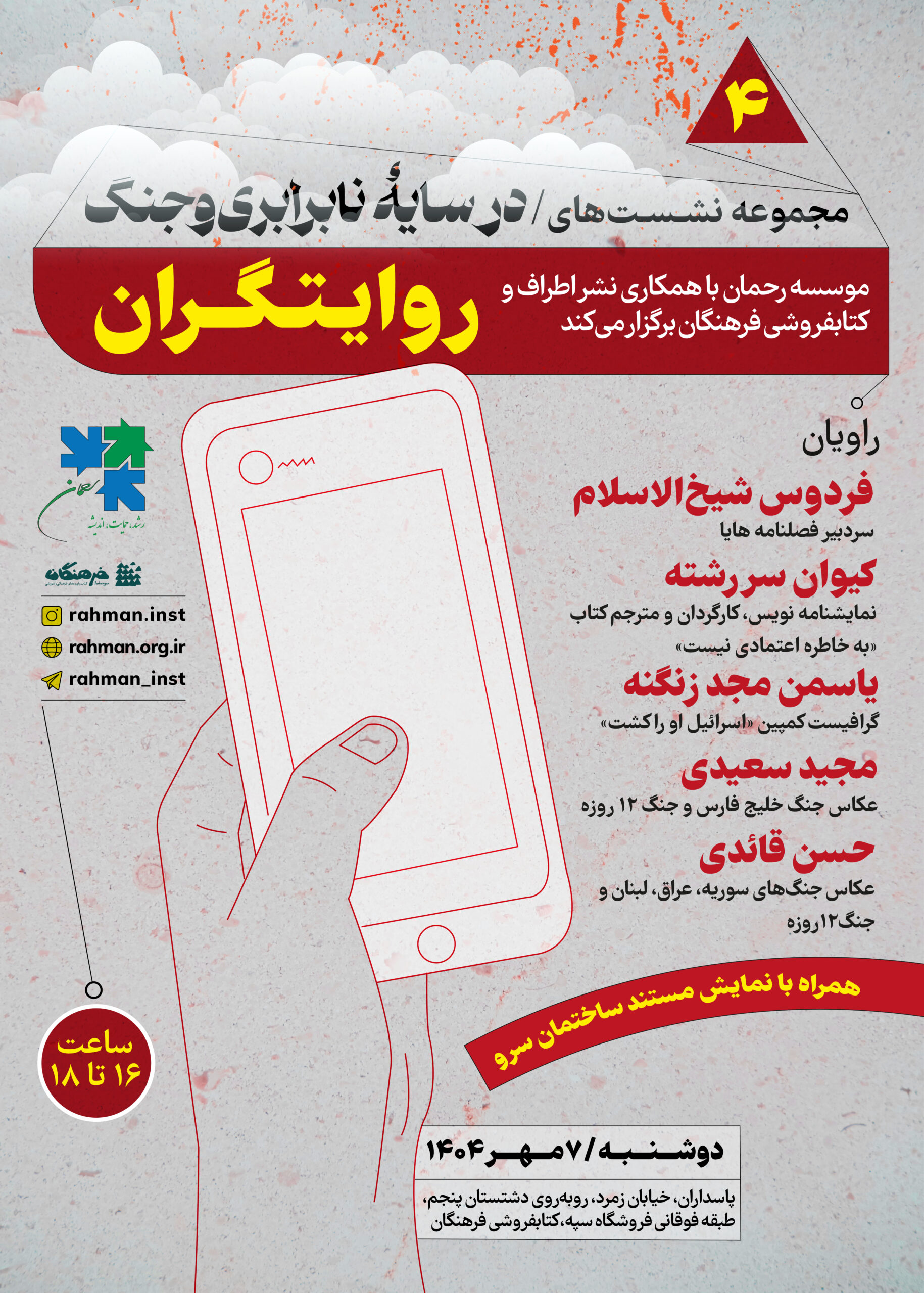 چهارمین نشست از سلسله نشستهای «در سایۀ نابرابری و جنگ» مؤسسۀ رحمان با محور روایتگران روز دوشنبه هفتم مهرماه 1404 برگزار شد.